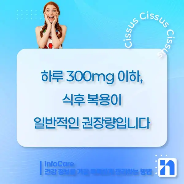 부작용을 피하려면 언제, 얼마나 먹는지가 중요합니다. 시서스를 복용할 때는 제품 형태, 용량, 섭취 시기를 고려한 맞춤 복용법이 중요합니다. 일반적으로는 하루 300mg이하의 시서스 추출물이 권장량으로 제시되며, 대부분의 제품은 이 기준에 맞춰 설계되어 있습니다.