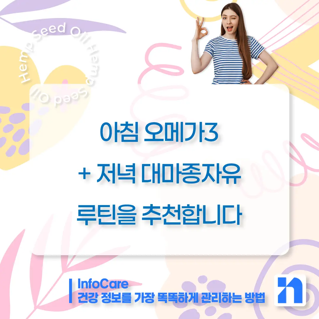 대마종자유 vs 오메가3, 둘 중에 정답은 없습니다. 내 몸에 맞는 루틴이 가장 좋은 선택입니다. 어떤 오일이 더 좋다고 단정하기보다는, 내 건강 루틴과 목적에 따라 선택하는 것이 가장 현명한 방법입니다.