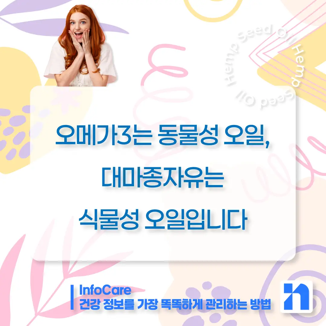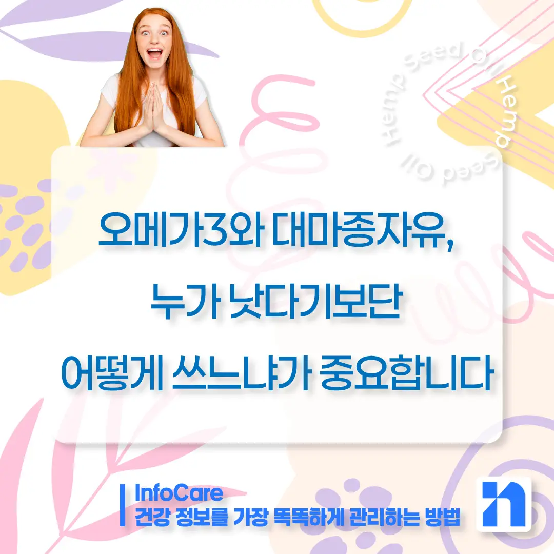 즉각적인 기능적 작용을 원한다면 오메가3, 식물성 기반의 장기 루틴은 대마종자유가 적합합니다.
