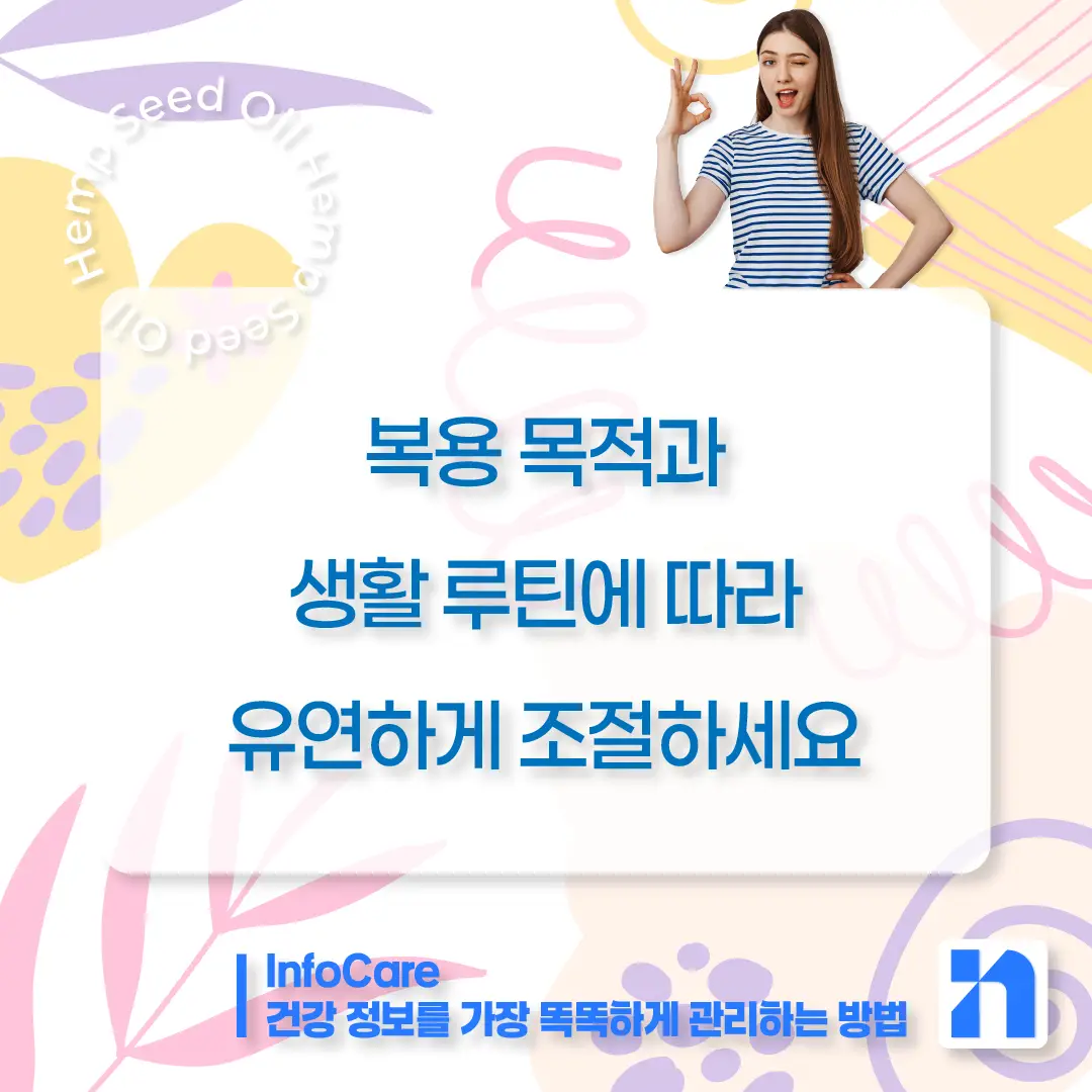 - 대마종자유: 아침 공복 또는 요리에 활용 가능, 하루 1~2스푼 권장