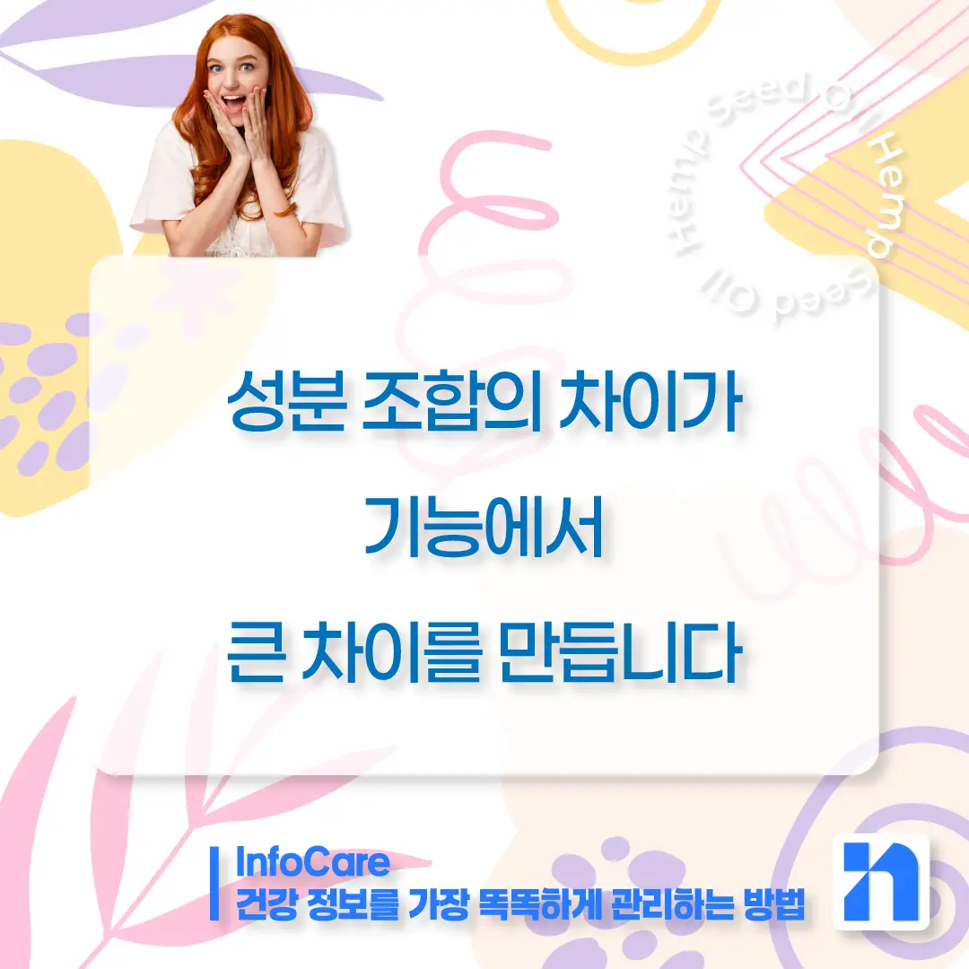 - 대마종자유는 피부 염증, 여성호르몬 균형, 만성 염증 관리를 위한 루틴에 더 적합한 선택지입니다.
