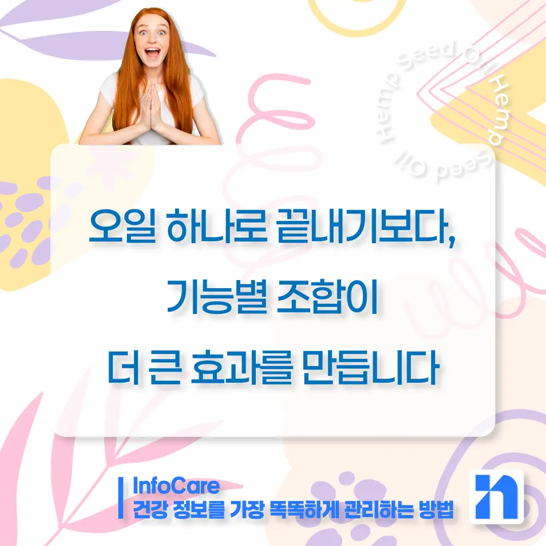 이제 오일도 단순한 영양 보충이 아니라, 목적 중심의 선택이 필요한 시대입니다. 오늘부터 나에게 필요한 오일을 찾아보세요. 오일 선택, 이제는 루틴입니다.